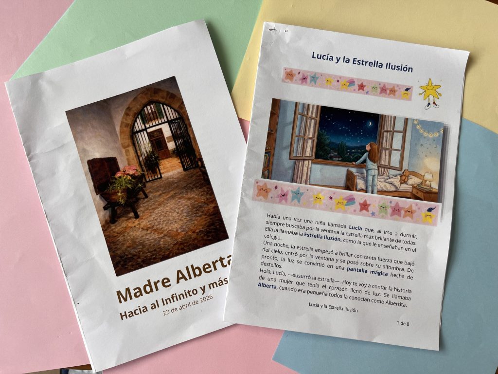 Hoy también celebramos el Día del Libro y seguimos vinculándolo a M. Alberta. Ella nos ha dejado un legado de libros y obras muy importantes para nuestra comunidad. Tenemos la suerte de contar con hermanas que, con mucha delicadeza, han reescrito de manera sencilla la vida e historias de la Madre. Por eso, le pedimos a la Hna. Raquel que preparase un pequeño libro con dos historias: una dirigida a los más pequeños y otra para los mayores.